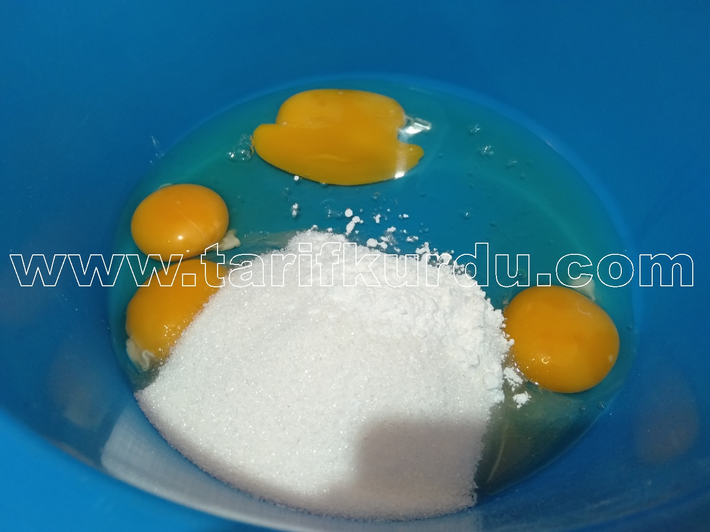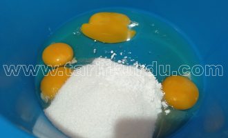 Öncelikle yumurtaları, şekeri ve vanilyayı köpük köpük olup rengi açılana dek bir güzel çırpalım.