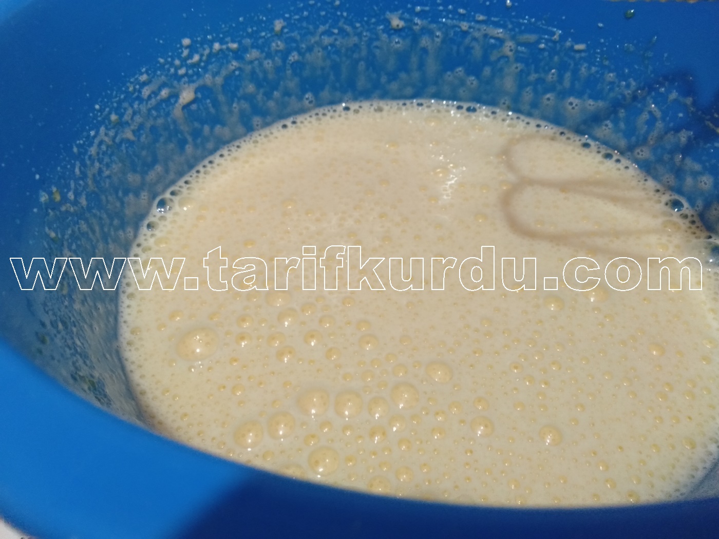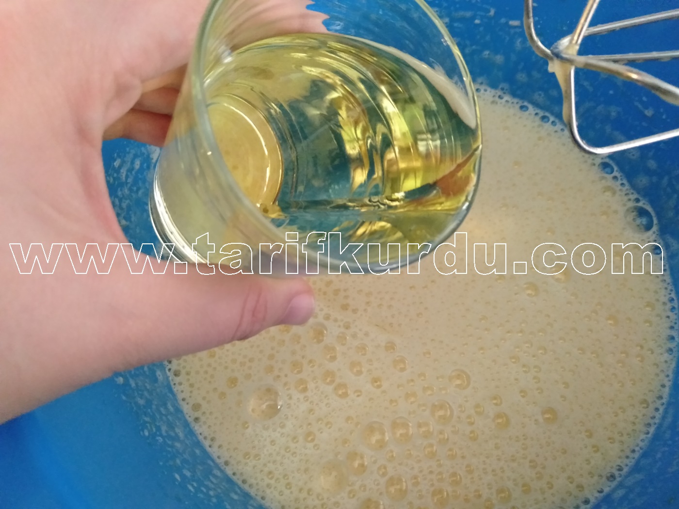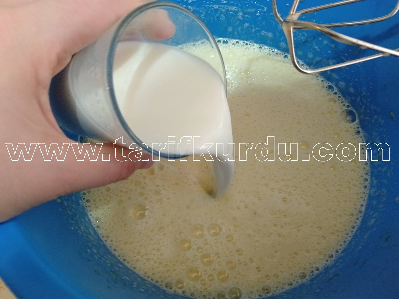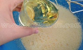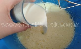 Daha sonra sıvı yağ ve sütü de ilave edelim ve tekrar çırpalım.