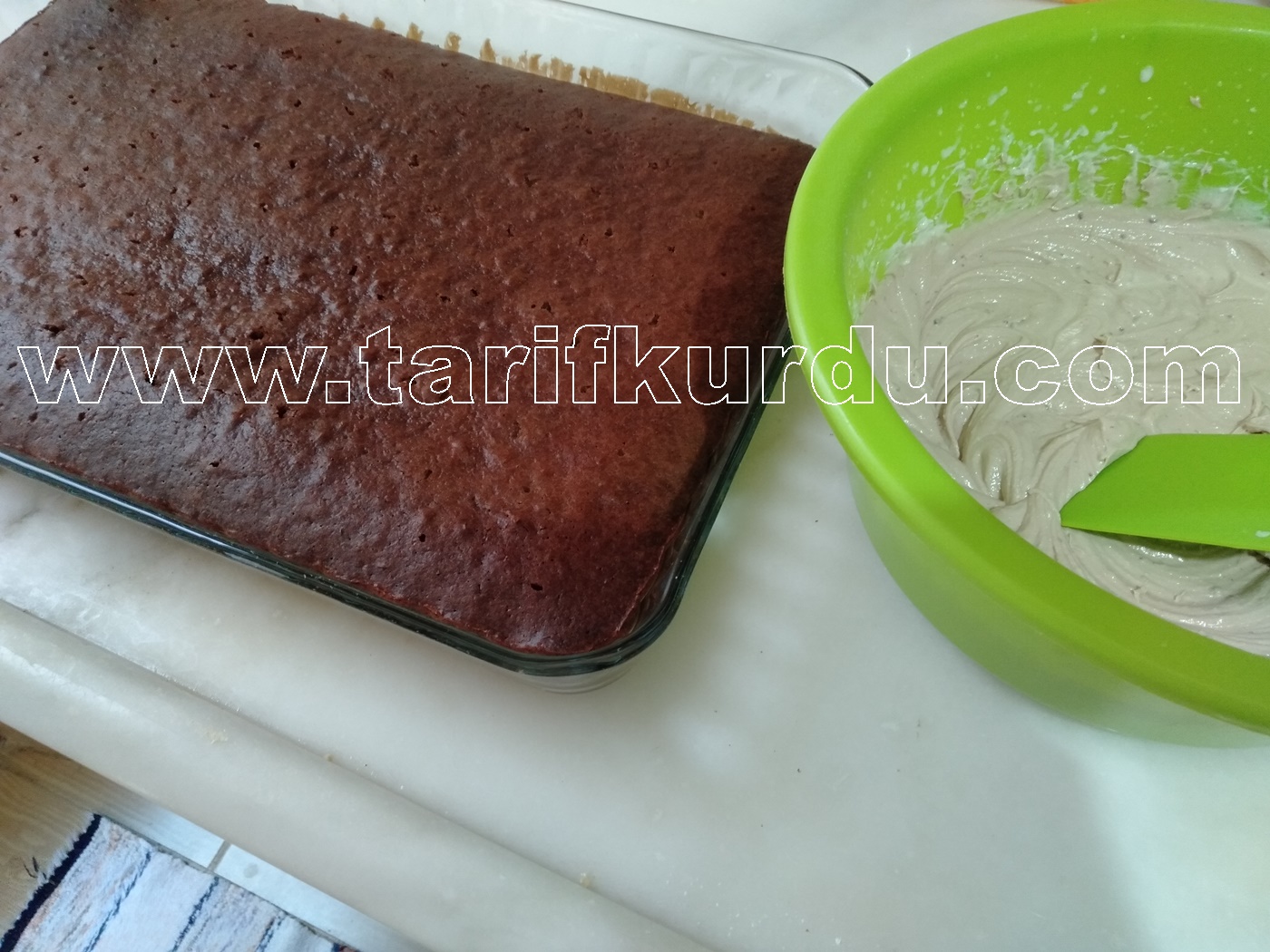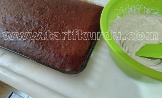 Sosta hazır olduğuna göre sosu ılımaya bırakıp, dolapta beklettiğimiz kremayı kek iyice soğuduktan sonra kekin üzerine eşit şekilde yayalım.
