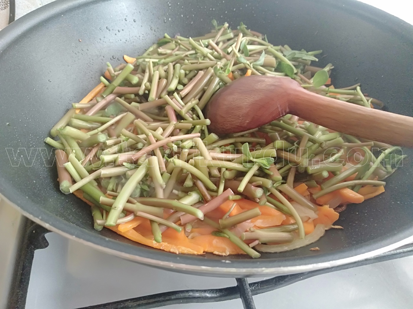 Biraz solduktan sonra içerisine yıkayıp ayıkladığımız semizotunun sap kısımlarını da doğrayıp koyalım.