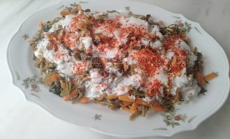 Servis edeceğimiz tabağa alalım ve üzerine yoğurt ile pul biber gezdirip servis edelim.