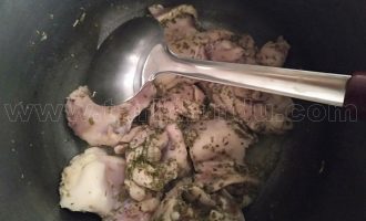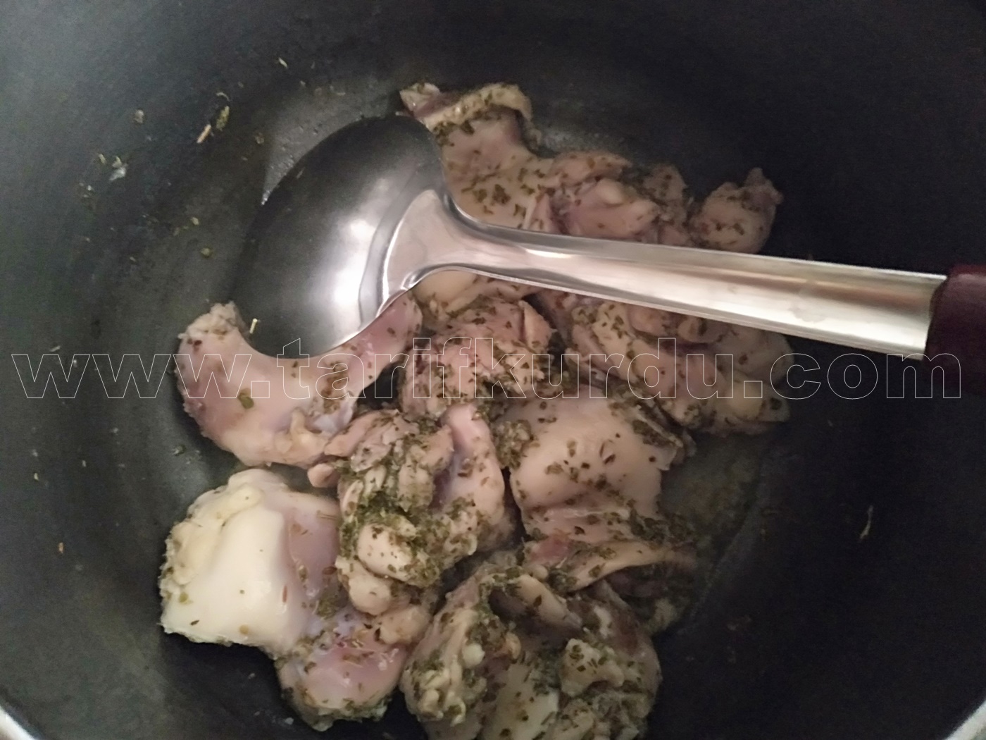 • Tencerede tavuk suyunu bırakıp rengi dönene dek pişecek tavuklar.