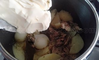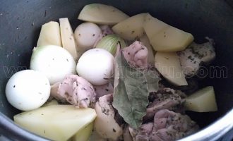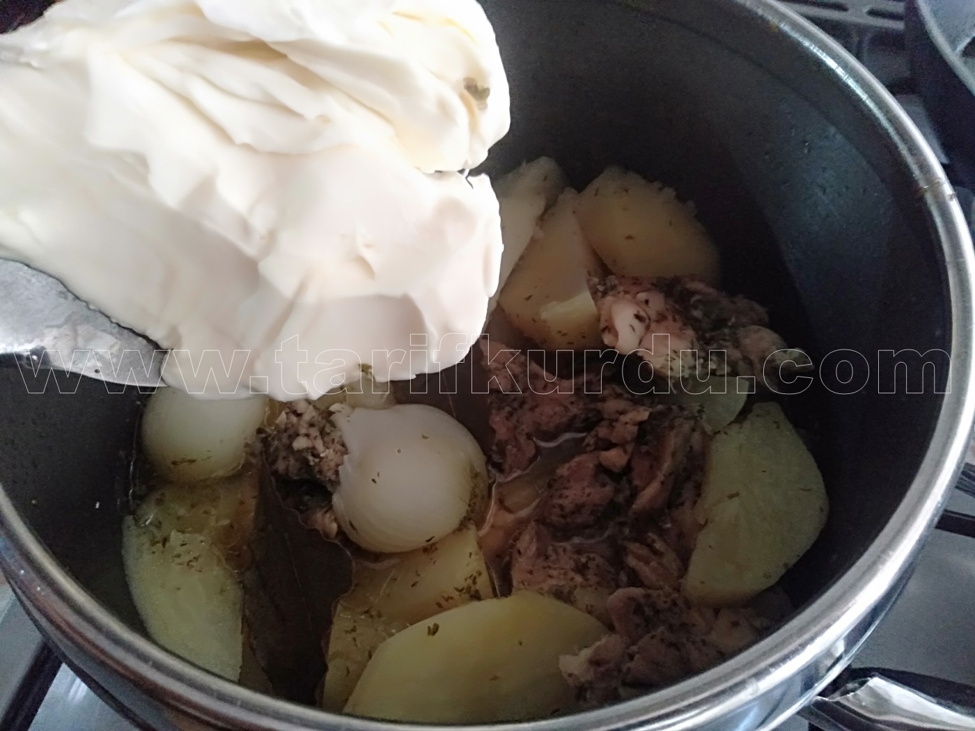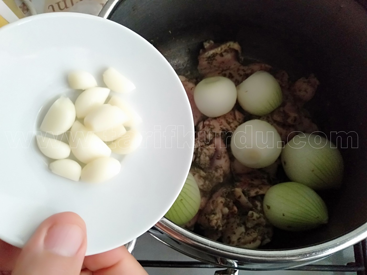 Suyunu ilave ettikten sonra tavuğun kokusunu alması için 2-3 adet defne yaprağı da ilave edelim.